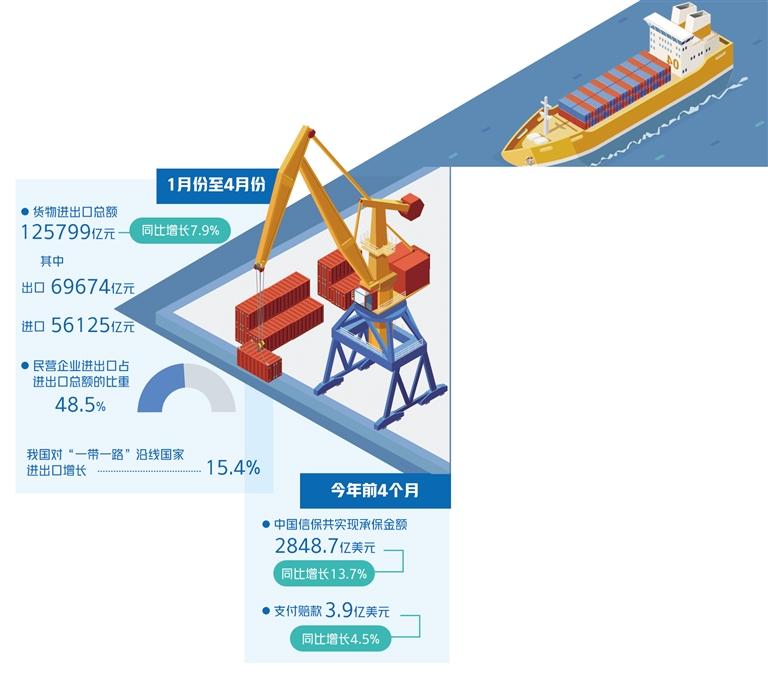 今年3月份以來,國內(nèi)新冠肺炎疫情呈多點(diǎn)散發(fā)態(tài)勢,防控形勢依舊嚴(yán)峻,相關(guān)部門不斷出臺(tái)政策全力保障外貿(mào)企業(yè)開展經(jīng)營。5月5日召開的國務(wù)院常務(wù)會(huì)議提出,要加大外貿(mào)企業(yè)信貸投放,支持銀行不盲目抽貸、斷貸、壓貸,梳理一批亟需資金的予以重點(diǎn)支持;擴(kuò)大出口信保短期險(xiǎn)規(guī)模;保持人民幣匯率基本穩(wěn)定。最新統(tǒng)計(jì)數(shù)據(jù)顯示,1月份至4月份,貨物進(jìn)出口總額125799億元,同比增長7.9%。其中,出口69674億元,增長10.3%;進(jìn)口56125億元,增長5.0%。民營企業(yè)進(jìn)出口占進(jìn)出口總額的比重為48.5%,比上年同期提高1.4個(gè)百分點(diǎn)。我國對(duì)“一帶一路”沿線國家進(jìn)出口增長15.4%,其中出口增長12.9%,進(jìn)口增長18.6%。